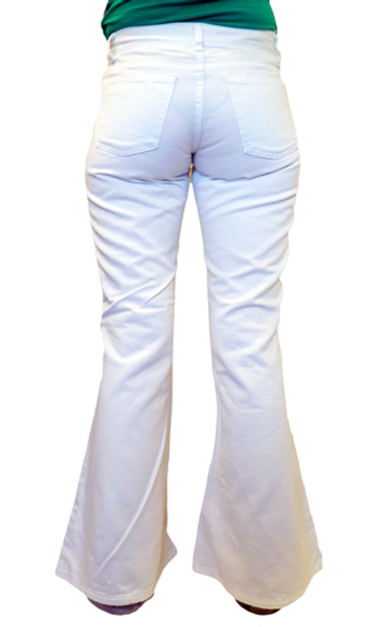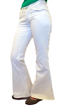 ‘BRIGHT LIGHTS FLARES’ – RETRO SIXTIES/SEVENTIES DENIM FLARES BY MADCAP ENGLAND – Madcap England Cotton Denim Flares in White. 5 pocket design. Button waist with zip fly. Low rise hipster waist. 26″ flared bottoms.