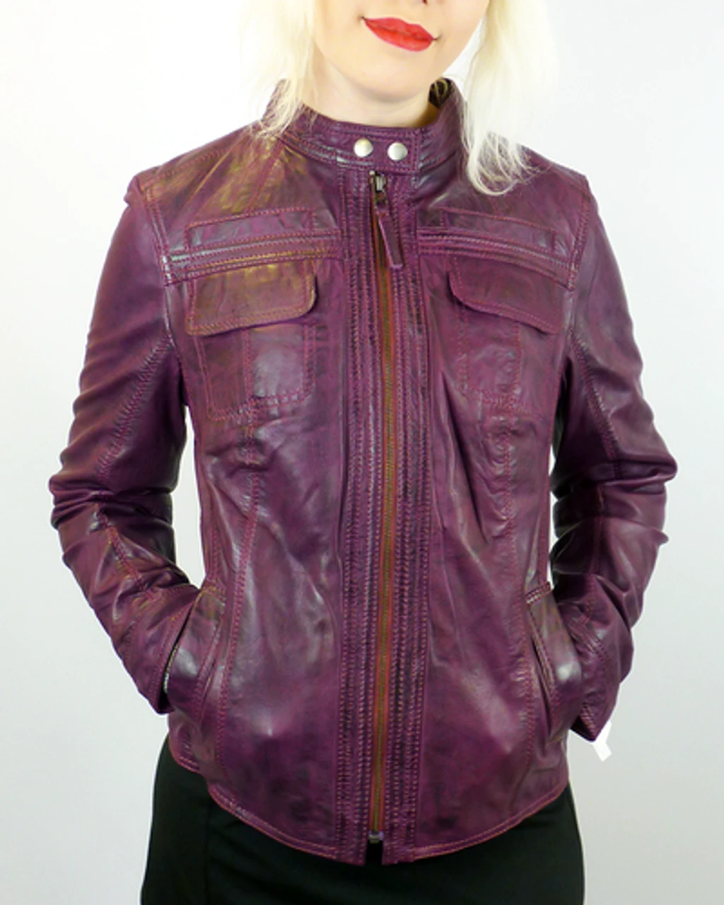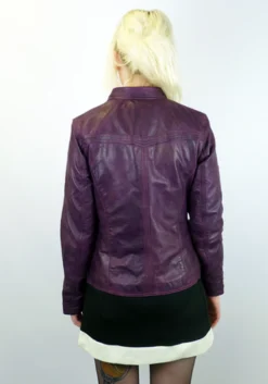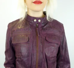 ‘CASINO’ RETRO SEVENTIES INDIE LEATHER RACER JACKET by MADCAP ENGLAND – Womens Vintage berry Leather Racer Jacket with Psychedelic Sixties floral paisley lining. Side entry pockets, two flap over faux chest pockets, zip through. Retro metallic snap stud detail to racer collar tab. Neat panel stitch finish. ‘Casino’ vibrant Retro leather racing jacket by Madcap England.