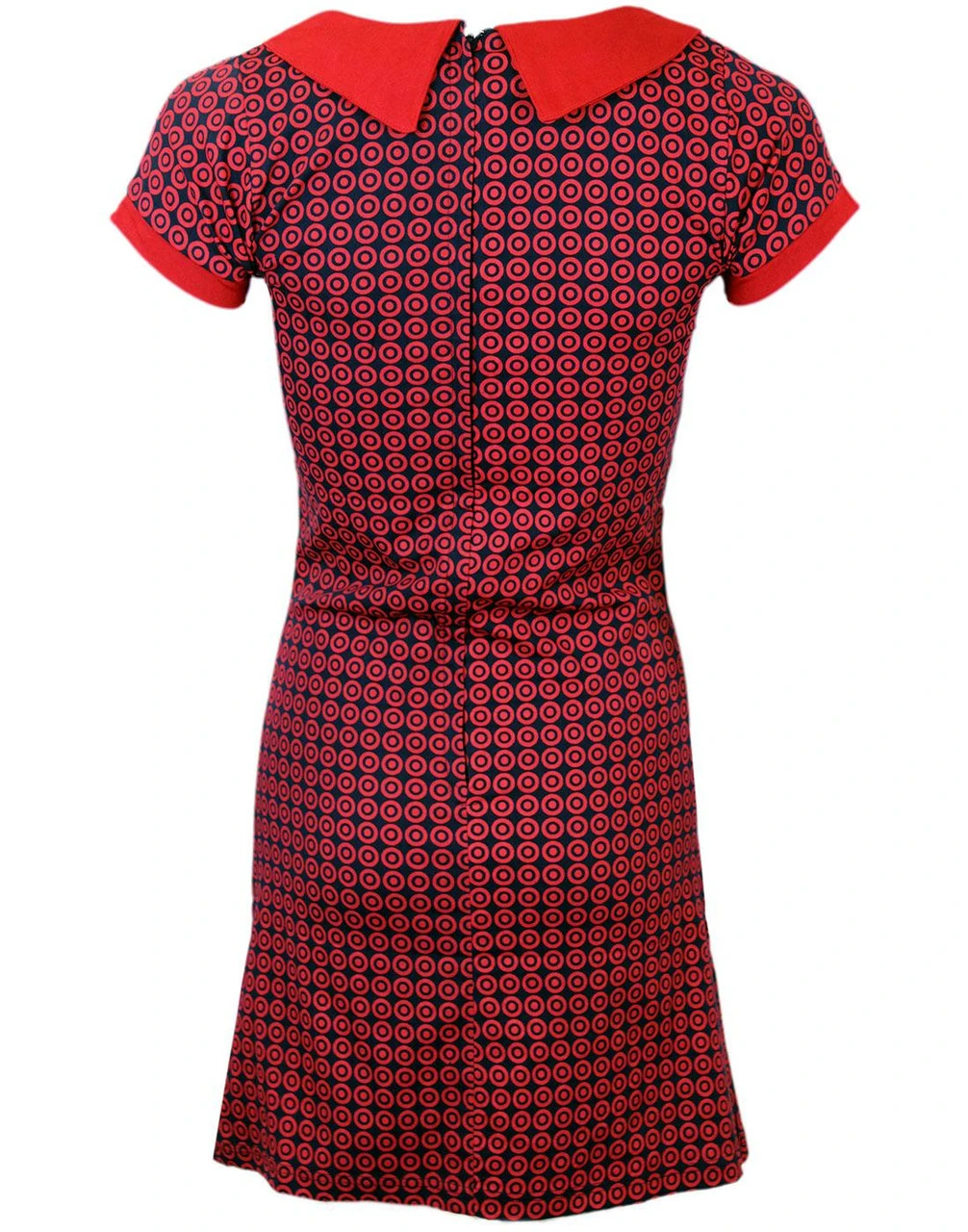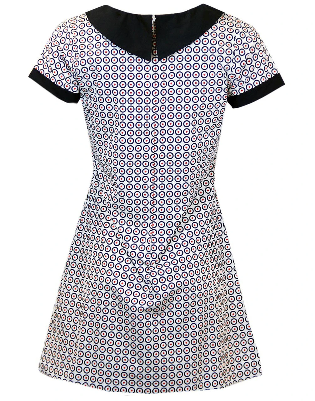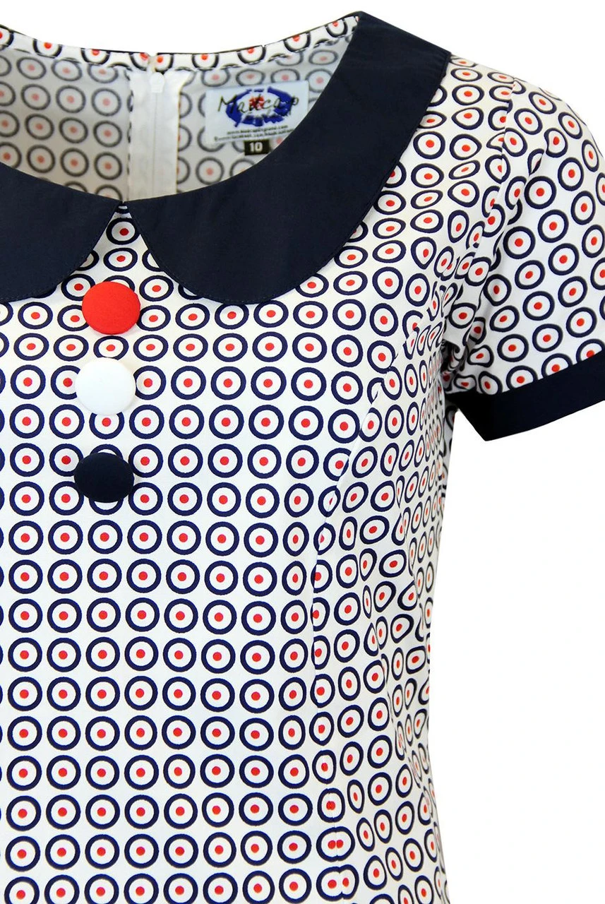 ‘DOLLIEROCKER’ RETRO SIXTIES PETER PAN COLLAR MOD TARGET DRESS – Navy blue Mod Target dress with Retro Sixties Peter Pan collar, sleeve edges and 3 covered buttons all in red. Zip fasten to reverse. Slight stretch to fabric.