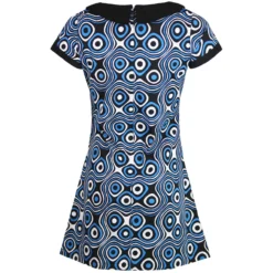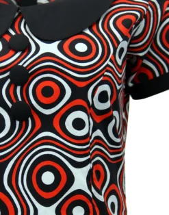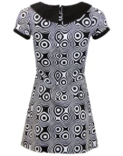 Key Points: Madcap England ‘Dollierocker Op Art’ psychedelic print dress with Peter Pan Collar and covered button details.