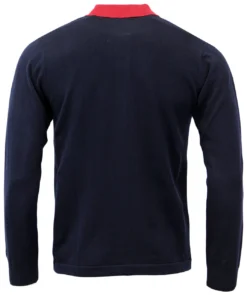 ‘DONOVAN’ MENS RETRO SIXTIES MOD STRIPE PANEL BUTTON THROUGH POLO CARDIGAN by MADCAP ENGLAND – Mens navy, maroon and white Retro stripe panel knitted polo cardigan. Mod fold down polo collar, open welt hem and ribbed cuffs. Branded Madcap England buttons, tonal signature embroidery to sleeve. Classic Retro style with a Mod, Steve Marriott influence. ‘Donovan’ Polo Cardigan by Madcap England.