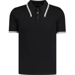 Empire is a popcorn waffle knitted polo shirt, here in black with classic retro Buckthorn tipping to the 60s mod spear collar and cuffs. Fine gauge knitted construction, fashion stitch sleeves and tonal signaature buttons. Finished with our discreet Octopus embroideryto the sleeve. The point collar is sharp and stylish, borrowing from 1960s mod fashions and ensures that the Empire Polo Top is well suited for a tailored retro look.