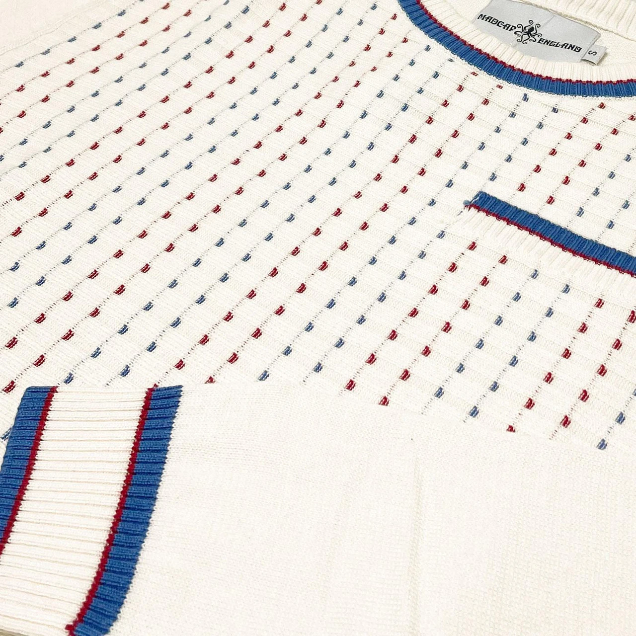 - Red and Blue jacquard dash detailing.