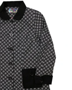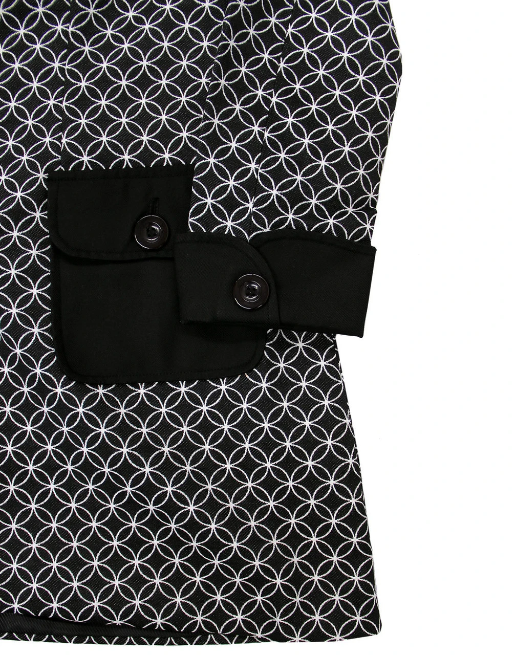 – Monotone Op Art jacquard circle flower design in white on textured black ground.