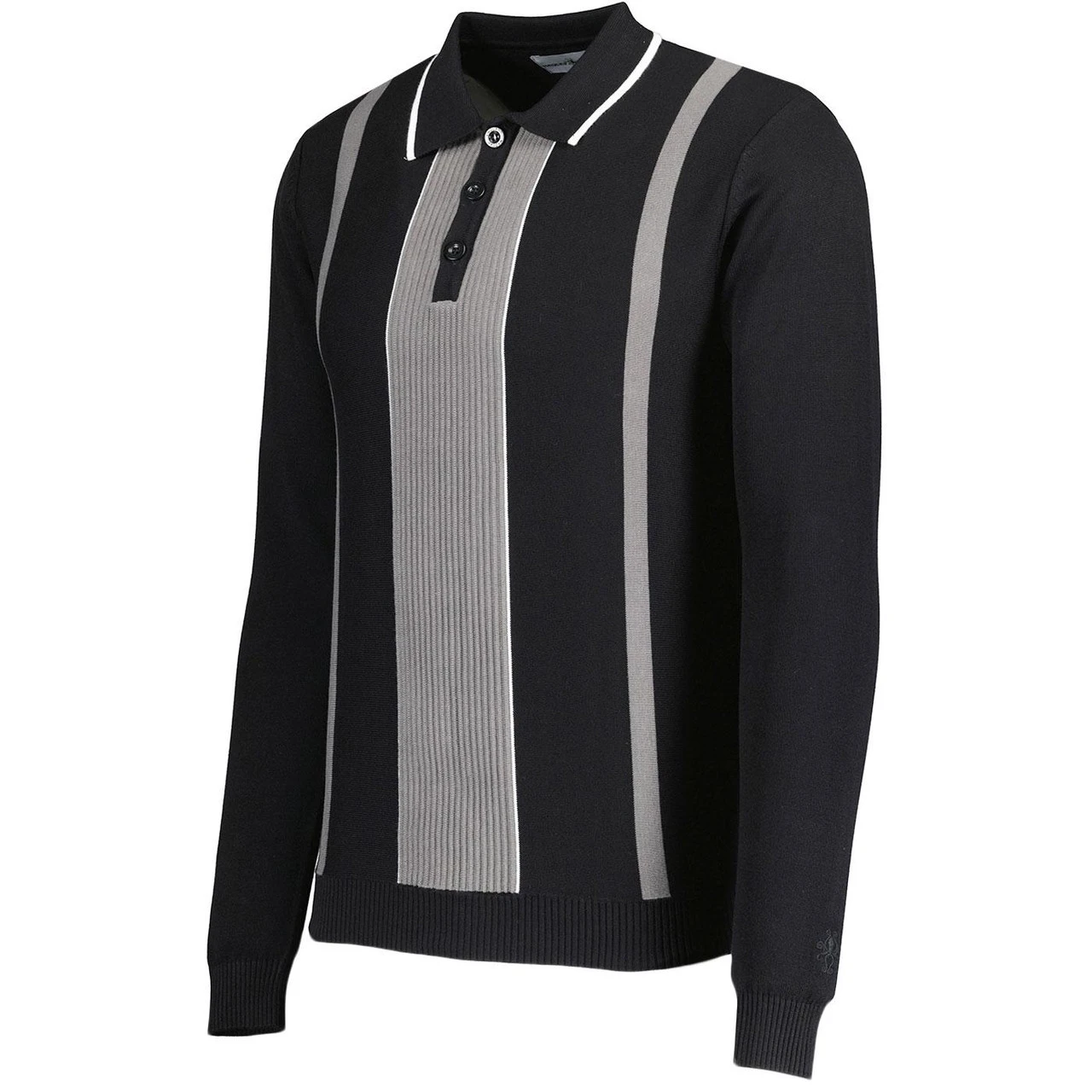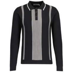Nova Ribbed Panel Knitted Polo Shirt in Black with White Tipping. This mod knit polo top features a cool grey contrast retro ribbed panel to the front that is flanked by white accents. The Nova boasts a clean and sharp mod look that blends retro 60s textured knit elements with fine gauge cotton main body. Contraast grey stripes,tonal signature buttons and our discreet Octopus embroidery just above the left cuff add the finishing touches.Â