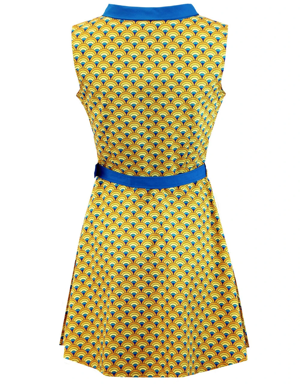 – Madcap England ‘Peacock Minnie’ 1960s mod Op Art mini dress in yellow and teal.