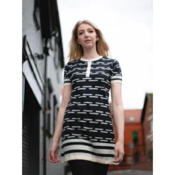 - Abstrast dash broken stripes to body with contrasting stripes in off white to skirt hem and sleeve